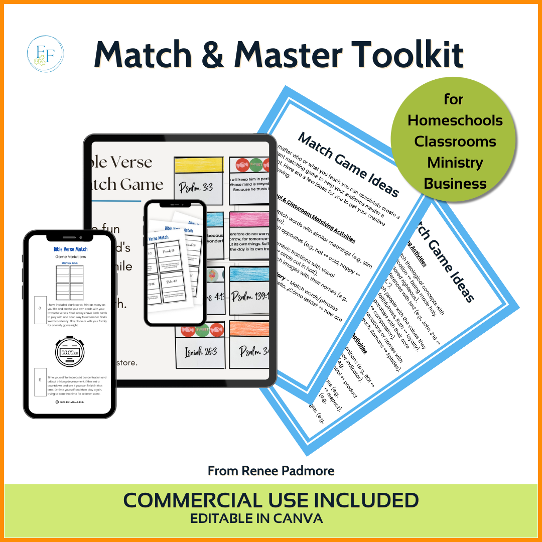 Lists of Matching Activity Ideas — tailored for homeschool, classroom, ministry, and business settings, giving you endless inspiration to create your own games.